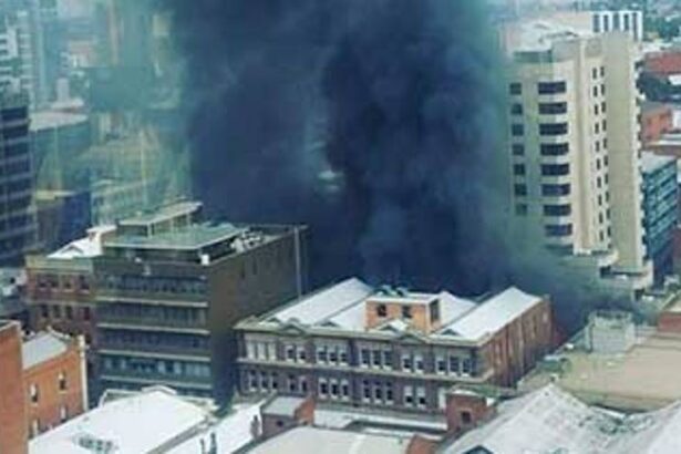 Khói có thể được nhìn thấy cuồn cuộn bốc ra khỏi tòa nhà hai tầng trên quán cà phê De La France ở góc đường George và Goulburn Streets vào khoảng 11 giờ 20 trưa 23/8.
