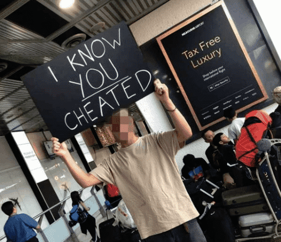 Một du khách tên là Aussie Krystal đã chụp một bức ảnh chàng trai cầm tấm biển có dòng chữ: “Tôi biết cô đã lừa dối tôi” và chia sẻ lên trang Twitter của mình: “Tại sân bay Melbourne ngày hôm nay. Anh ấy đang chờ đón người yêu phản bội của mình trở về”.