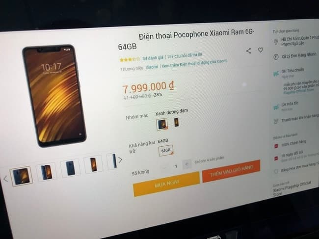 Cụ thể, chiếc Pocophone F1 được thông báo giảm giá 28% từ 11,1 triệu đồng xuống còn 8 triệu đồng cho phiên bản RAM 6 GB, bộ nhớ trong 64 GB. Tuy nhiên trên thực tế, chiếc máy này khi bán ra chính hãng đã có mức giá 7,9 triệu đồng và được tặng kèm quà khuyến mãi.