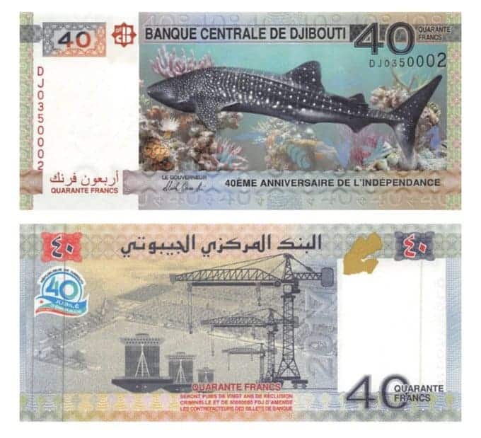 Djibouti là một quốc gia nhỏ bé tại châu Phi với dân số dưới một triệu người. Tuy nhiên, tờ 40 franc mới phát hành của nước này lại vào top 6 tờ tiền đẹp nhất năm qua. Một mặt tờ tiền in hình loài cá mập voi quý hiếm đang bơi trong rạn san hô. Mặt còn lại là hình ảnh cảng biển, một ngành phát đạt tại đây, nhờ nằm nay tuyến hàng hải quan trọng. Tờ tiền có giá trị tương đương 0,2 USD.