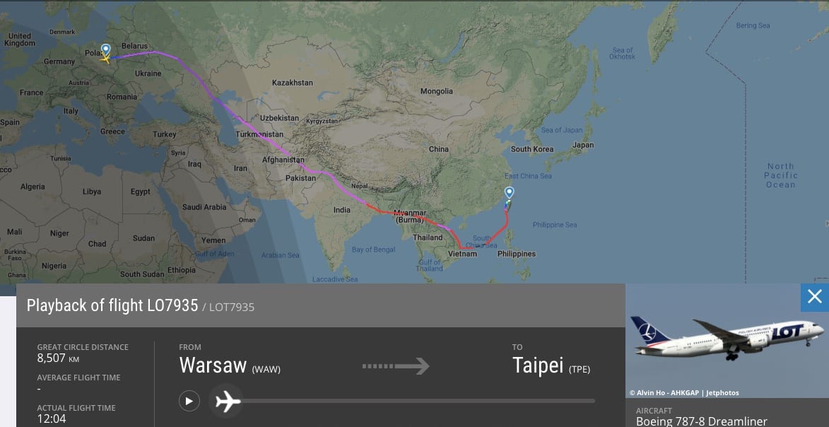 Tuy vậy, dữ liệu trên Flightradar cho thấy chuyến bay đã tới Đài Loan muộn hơn 2 tiếng so với kế hoạch. Nguyên nhân là bởi chính phủ Trung Quốc từ chối cho phép chiếc máy bay này bay trên không phận của họ. Do vậy, máy bay LOT phải bay vòng xuống khu vực Đông Nam Á để tới Đài Loan.