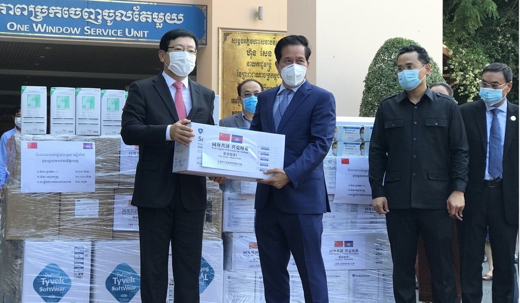 Lô hàng 20.000 khẩu trang y tế, 3.000 khẩu trang N95 và 500 bộ quần áo bảo hộ của Thượng Hải gửi tới Phnom Penh, thủ đô Campuchia. Ảnh: Xinhua. |