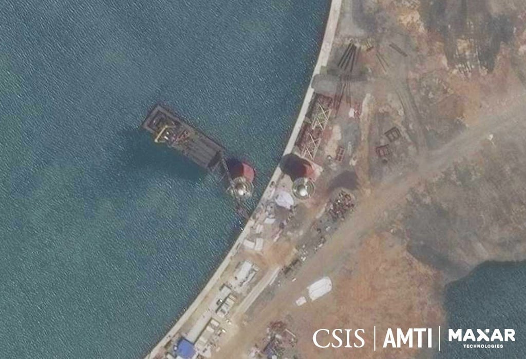 | Một trạm E nổi đang được đưa xuống biển vào tháng 4/2018. Ảnh: CSIS/AMTI/MAXAR. |