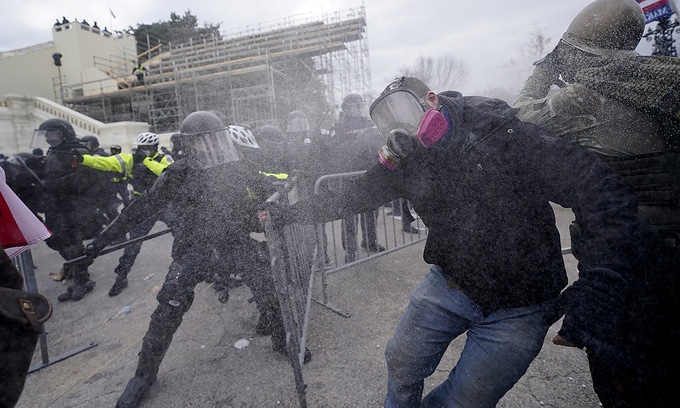 Cảnh sát chống bạo động dùng dùi cui và hơi cay đẩy lùi người biểu tình đang cố phá vỡ hàng rào an ninh bên ngoài nhà quốc hội Mỹ, ngày 6/1. Ảnh: WP.