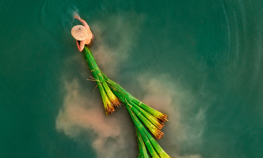 Khoảnh khắc người dân Long An thu hoạch cỏ bàng giành giải nhất mục Chân dung của cuộc thi ảnh trên cao Skypixel.