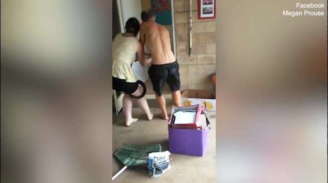 Trong một video đăng trên Facebook, Charlie Bear và Tom Geary vật lộn để cho con trăn vào một cái túi màu đen tại nhà dân ở Mission Beach, Bắc Queensland, nước Úc.