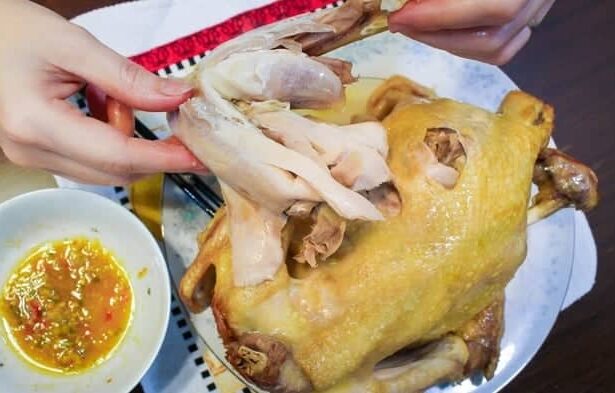 – Rửa sạch gà với nước, tiếp đó rửa lại với rượu trắng để khử mùi thịt gà, rửa lại với nước rồi để ráo.