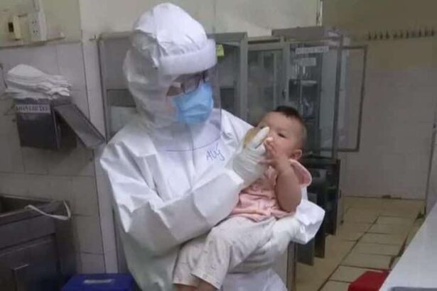 Vì hai bé còn quá nhỏ, các bác sĩ, y tá thay phiên nhau pha sữa, thay tã, tắm và cho các bé ăn. Hình ảnh bác sĩ Thúy mặc đồ bảo hộ kín mít vừa bế vừa cho bé 7 tháng tuổi bú bình được chia sẻ trên mạng xã hội khiến nhiều người xúc động.
