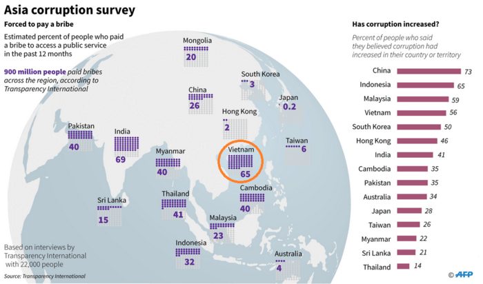 Theo Tổ chức Minh bạch Quốc tế, cứ 100 người VIệt thì có 65 người đưa hối lộ trong các dịch vụ công, đặc biệt là hối lộ cho cảnh sát, trường học và bệnh viện. Đặc biệt, khảo sát này nhận thấy người giàu thường chấp nhận “chung chi” nhiều hơn người nghèo, nhằm tiếp cận dịch vụ nhanh chóng và được hỗ trợ tốt hơn.