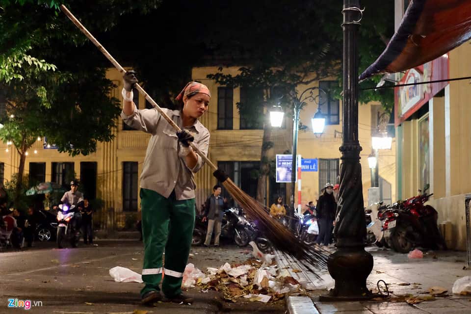 | Gần 1h, lực lượng vệ sinh bắt đầu dọn dẹp “bãi chiến trường” này. Một công nhân vệ sinh cho biết anh sẽ phải dọn hết tất cả rác thải này mới được nghỉ. |