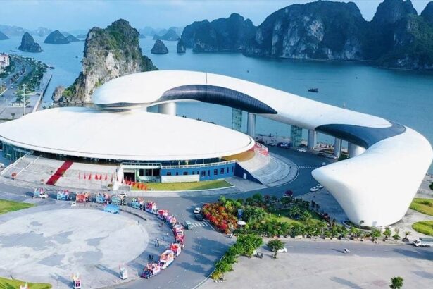 Công trình có hình tượng chú cá heo vờn trên sóng nước Hạ Long, được thiết kế bởi kiến trúc sư nổi tiếng người Tây Ban Nha Salvador Perez Arroyo. Đây là một trong những điểm “check in” nổi tiếng cùng với tòa nhà Bảo tàng – thư viện Quảng Ninh bên cạnh.