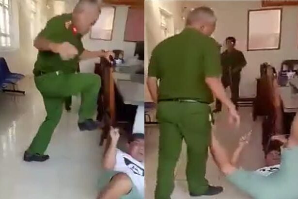 Đến khi có 1 người mặc cảnh phục khác can ngăn thì người tóc bạc mặc cảnh phục mới thôi đạp người đàn ông nằm dưới sàn nhà.