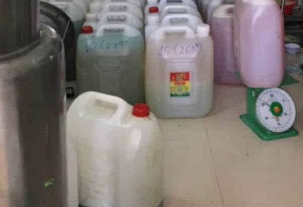 Nguyên liệu chứa trong các can nhựa không nhãn mác bị thu giữ tại cơ sở. Ảnh: Ban Quản lý An toàn thực phẩm TP HCM. |